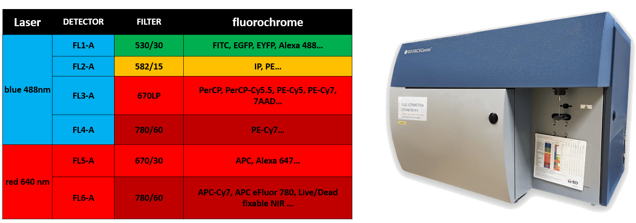 | FACSAria Fusion (Becton Dickinson) The BD FACSAria Fusion is an easy-to-use cell separator that allows the separation of a large number of samples of different origins. It is installed in a Class II Type A2 biosafety cabinet equipped with an integrated aerosol containment system that operates independently. Some technical features are detailed below: Equipped with four excitation lasers 405 ,488, 561and 640 nm. Eighteen detectors (16 fluorescence + 2 scattering) of which 5 are for the 405nm laser (450/40, 525/50, 610/20, 660/20, 710/50, 780/60), 2 for the 488nm laser: 530/30, 695/20, 4 for the 561nm laser: 610/20, 670/14, 710/50, 780/60 and 3 for the 640nm laser: 670/30, 730/45, 780/60. It is also equipped with a temperature control system and sample agitation. |